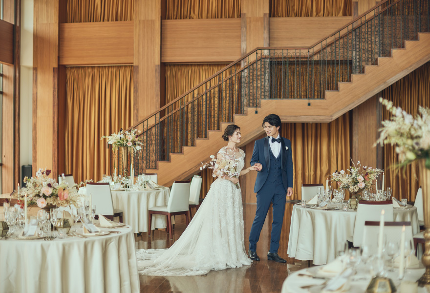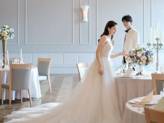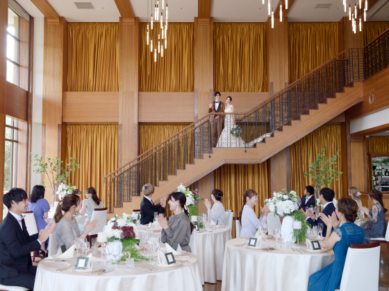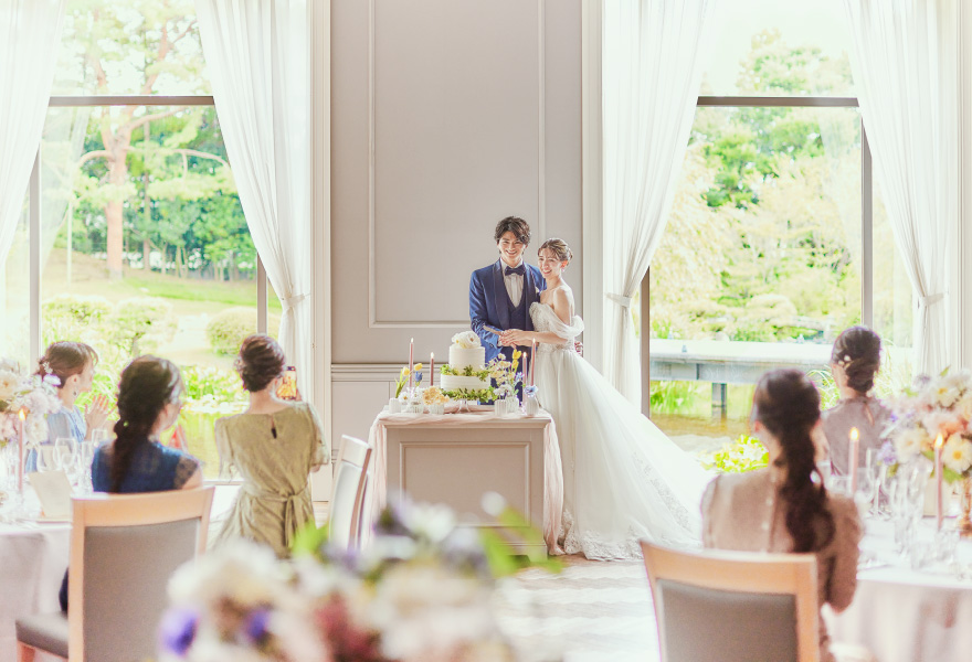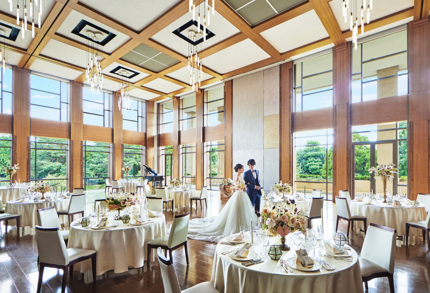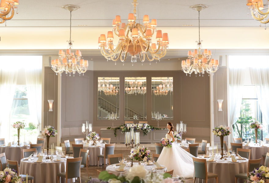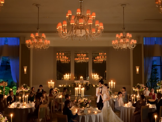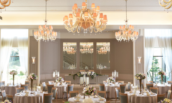 シャンデリアの優美な光、匠の技が冴えるウッドフロア。庭園に面した窓から見える絵画のような花々。すべて本物でしつらえた最上級の舞台をご用意しました。
