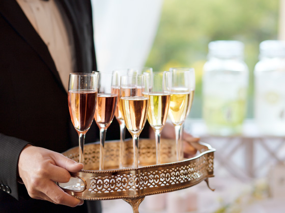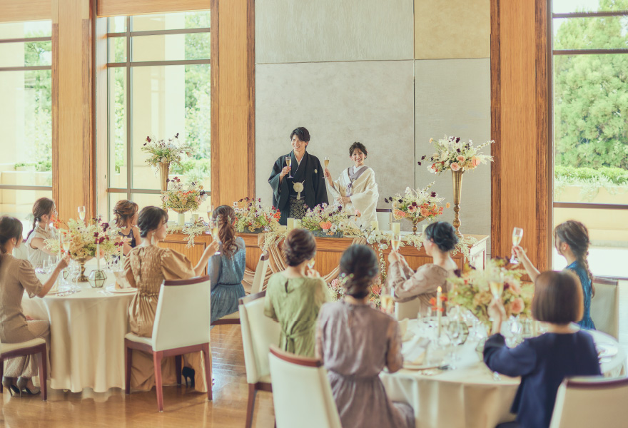 お招きしたゲストを最初におもてなしするのは、眼下に広がる息をのむような庭園の眺めと、ようこその気持ちを満たしたウエルカムドリンク。