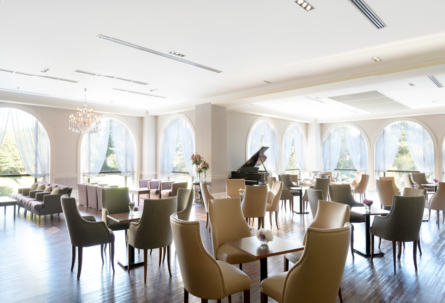 木漏れ日が美しいイチョウ並木に迎えられて、シャンデリアがきらめくロビーから見晴らしのいいラウンジへ。